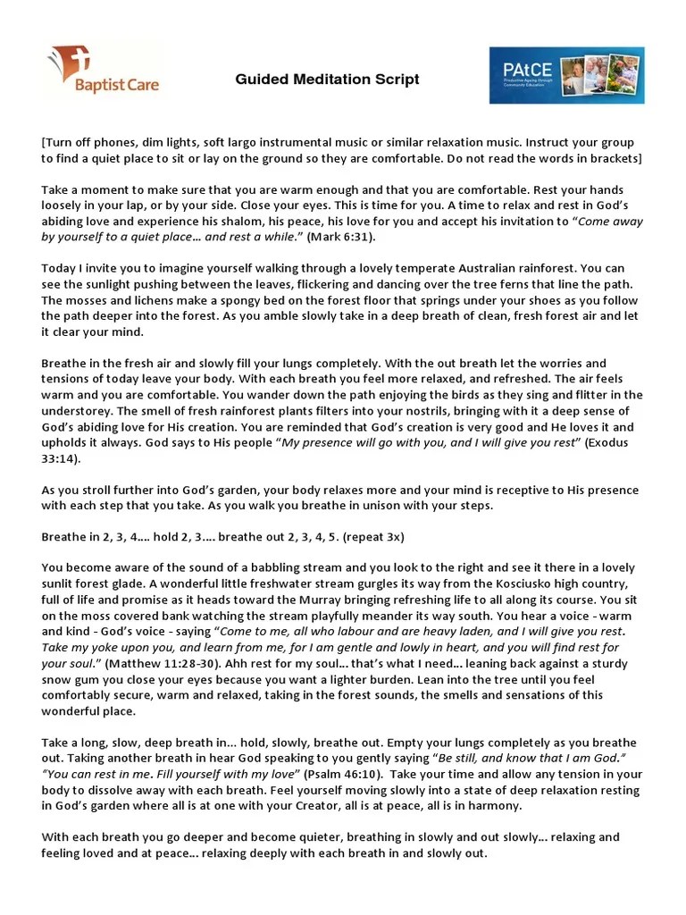 You can also find some lovely free relaxation scripts here. Guided meditation for bedtime script. You can also download this mindfulness meditation script as a separate pdf file. The guided meditations and imageries in both volumes of 30 scripts will help you explore and develop your internal life of thought, emotion, and spirit. Be aware of any tension in your.