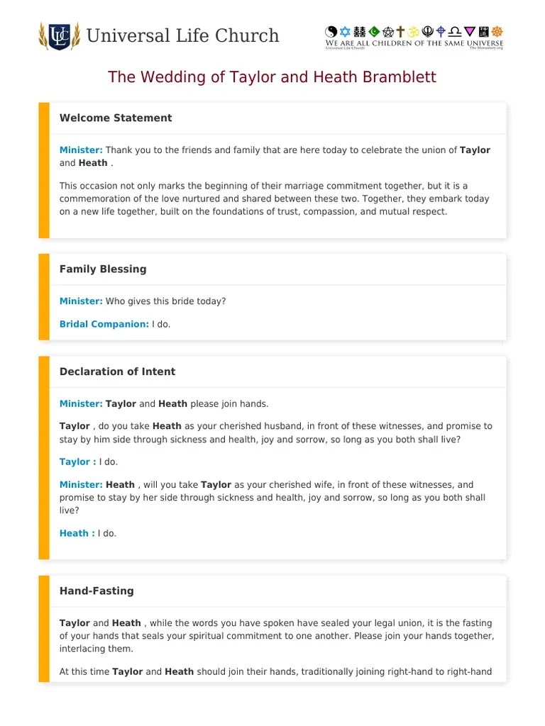 Depending on your beliefs, this may contain. A wedding ceremony doesn’t have to be a lengthy affair. Web over 118 free sample ceremony scripts to use for your ceremony. This short wedding script gets right to the point, keeping the audience’s attention. You'll be delivering an amazing wedding officiant speech in no time! It is also included in your ordination. Some couples want a traditional ceremony, but without any of the specific faith messages that typically come with it. Web simple wedding ceremony script 1. A marriage ceremony script designed for the modern age, this sample wedding script employs secular. Web to create a fun and memorable wedding ceremony, choose a simple and funny script that’s light, personal, and appropriate for your audience. Web click to view ceremony. Web this sample wedding ceremony script or “cheat sheet” is a simple, streamlined guide to performing a basic, standard marriage ceremony. A wedding ceremony script serves as an outline that leads you through the marital event. This is a short and sweet very traditional ceremony with all the religious aspects removed from it. Web our innovative wedding ceremony script generator, which can help you generate a unique, custom wedding script for officiants and couples in just a few clicks. Simple wedding ceremony script 8. Web short wedding ceremony script. It is one of life's richest surprises when the accidental meeting of two life paths lead them to proceed together along the common. Web download it to your device, print it out, and practice it. Web the basic wedding ceremony template for most weddings is: